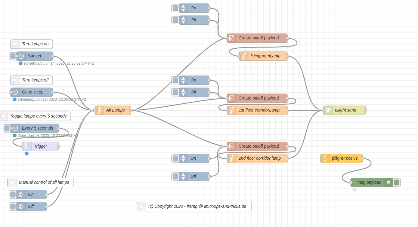 Wer möchte kann NodeRed gemäß dieser Anleitung auf einer Raspberry installieren, den Flow hier downloaden und ins eigene NodeRed importieren. Danach sind die Nodes noch den lokalen Gegebenheiten anzupassen und schon kann man seine 433MHz Schaltdoesen automatisch steuern lassen oder alternativ bzw zum Testen über das NodeRed UI ein- und auschalten lassen. Um z.B. alle Lampen blinken zu lassen muss man nur den Triggerausgang mit AllLamps verbinden.